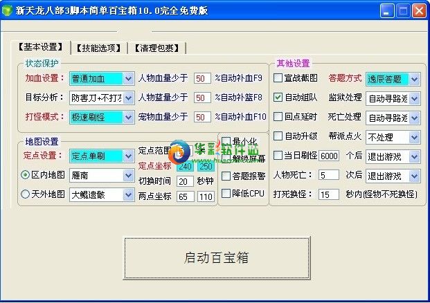 天龙百宝箱(天龙八部游戏辅助软件)V10.0绿色版脚本是一款绿色辅助工具,是按键精灵制作的脚本,操作简单。天龙百宝箱精简版它区别于其他站点的天龙八部脚本,天龙八部3免费脚本绿色辅助脚本解决升级困难的问题,不破坏游戏平衡。天龙百宝箱精简版