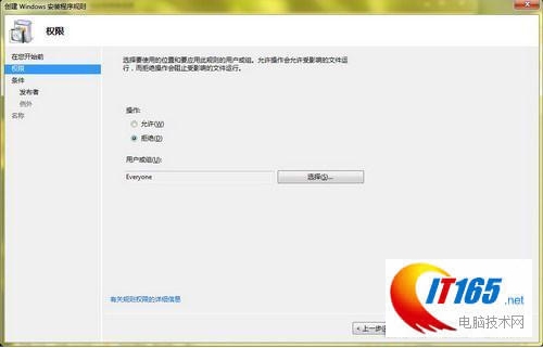 如控制用户安装windows程序时,在该分支的右侧窗口中单击“Windows 安装程序规则”选项,进入“Windows 安装程序规则”界面,在该界面中单击右键,在打开的右键菜单中选择“创建新规则”。打开“规则创建向导”对话框,单击“下一步”按钮,在“权限”项目中将 规则类型选择为“拒绝”,并在下面选择好拒绝的系统用户。