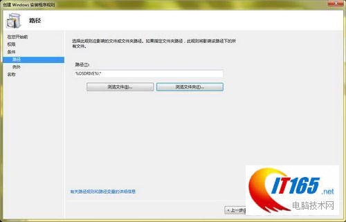 随后单击“下一步”按钮在“条件”项下选择一个规则类型,如“路径”,随后在下一界面中输入拒绝用户执行操作的路径,如拒绝用户访问“C盘”时,我们在此输入C盘盘符。