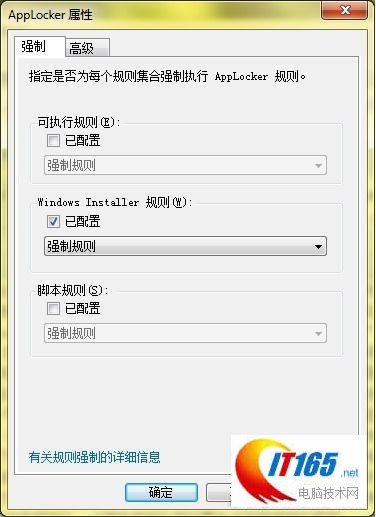 规则创建后,单击在组策略中单击“AppLocker”,随后在右侧的“AppLocker”界面,单击“配置规则强制”,打开规则设置对话框,在此我们将“Windows Installer规则”选择为“规则强制”,随后单击“确定”按钮即可。