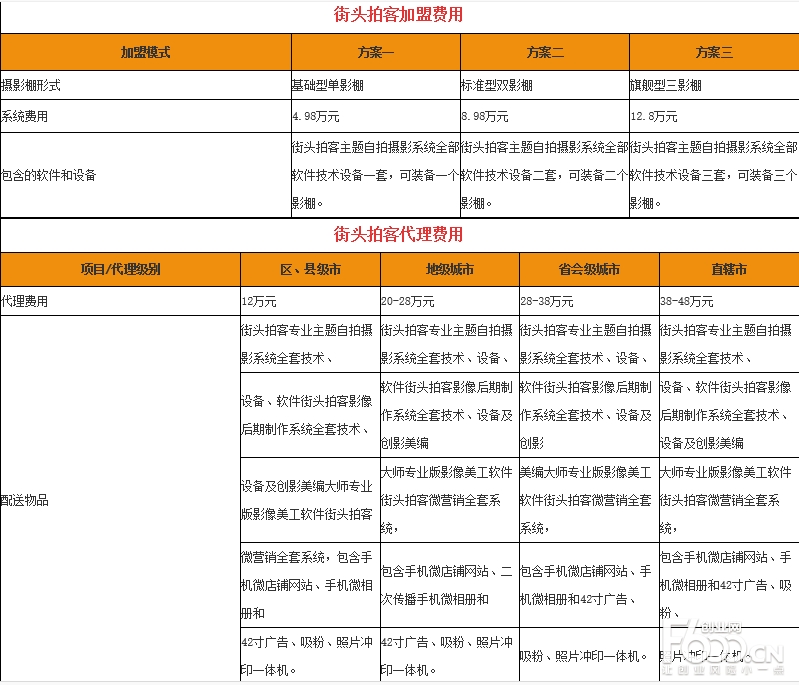 加盟街头拍客有三种方案,基础型单摄影棚,系统费用4.98万,街头拍客主题自拍摄影系统全部软件技术设备一套,可装备一个影棚。标准型双影棚,系统费用8.98万,街头拍客主题自拍摄影系统全部软件技术设备二套,可装备二个影棚。旗舰型三影棚,系统费用12.8万,街头拍客主题自拍摄影系统全部软件技术设备三套,可装备三个影棚。加盟者可以根据自己的实际情况选择最合适的加盟方式,街头拍客设备,总部提供,简单便捷无压力。