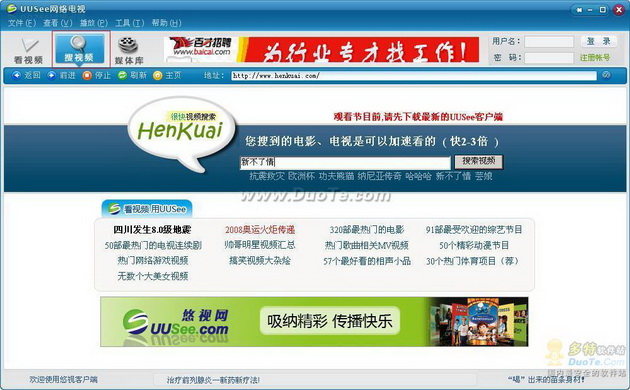 使用新版本的UUSee客户端已经有一段时间了,对它的搜索视频、观看视频以及视频管理功能有了一些心得,在此和大家分享一下。在笔者看来,这款网络电视客户端已经走向了体验、技术、功能的全新融合阶段,超越了目前网上流行的诸多同类型网络电视和网络视频播放平台。uusee网络电视2008
