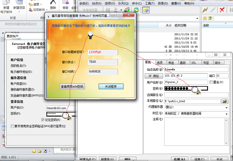 晨风星号密码查看器支持winxp、win7等所有windows平台,不但支持查看Outlook、FTP等桌面软件窗口下的密码,也支持查看Gmail、yahoo等网页式星号密码,还支持找回宽带拨号密码以及存储在路由器中的ADSL密码。此软件体积小,运行快,操作简便,是目前网上已知的最强大的星号密码查看器。