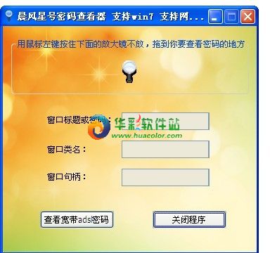 晨风星号密码查看器支持winxp、win7等所有windows平台,不但支持查看Outlook、FTP等桌面软件窗口下的密码,也支持查看Gmail、yahoo等网页式星号密码,还支持找回宽带拨号密码以及存储在路由器中的ADSL密码。此软件体积小,运行快,操作简便,是目前网上已知的最强大的星号密码查看器。