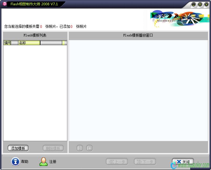 点击“添加模板”按钮,在弹出的打开文件对话框中选中我们给您提供的Flash模板后点击“打开”按钮,即可把模板添加到软件中。您可以预览模板的效果,选中模板后点击“下一步”。