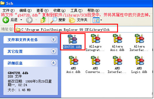 8、再安装国标码库:将文件“gb4728.ddb(国标库)”复制到Design Explorer 99 se/library/SCH目录中,并将其属性中的只读去掉。
