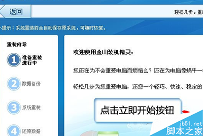 2、“接着,您再点击‘开始重装’按钮,这时就会弹出金山装机精灵的界面,我们就用这个工具来重装系统。”我继续介绍道。