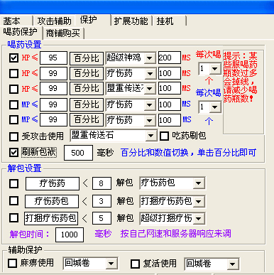 6、【喝药功能】自动买药,自动解包,游戏不卡,不掉药,每秒喝药最快可调到10瓶, 相当于锁血,能达到瞬间回满的效果。