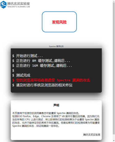对此,腾讯安全玄武实验室已推出漏洞检测工具,可检测的浏览器包括Chrome、Firefox、Edge、Safari,并独家支持iPhone和苹果电脑检测。企业用户可借助该工具实时检测浏览器安全状态。若检测结果表明浏览器易于遭受攻击,则说明风险真实存在。但由于可能存在未知攻击方法,所以如果检测结果表示浏览器不易遭受攻击,也并不一定代表电脑系统不存在漏洞。