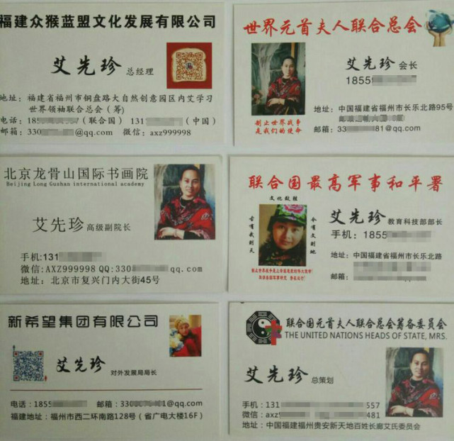 艾先珍在网站和社交app中印发了多张不同身份的名片,名片地址也多变。其中两张名片分别显示的地址为中国天津市武清区人民政府办公大院9层,联合国总部纽约市曼哈顿区东侧美国。