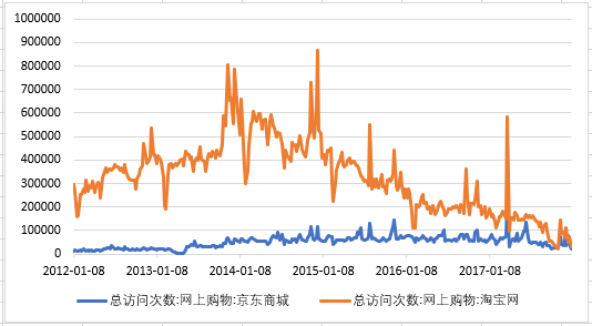 提及电子商务平台,国内最知名的两家公司分别是阿里巴巴旗下的淘宝网以及京东商城。从总访问数量上来看,淘宝网远远领先其竞争对手京东商城。两大电商系统的总访问数量总体呈现上升的趋势,这表明有市场的其它竞争对手的处于,分流了一些客户。