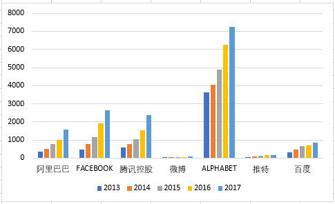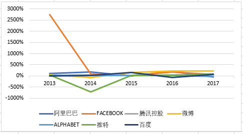从净利润来看,仅有推特处于亏损状况,但是从趋势来看,这个亏损的状况有所缩小。值得留意的是,脸书、腾讯、微博自2015年以来净利润保持上涨。阿里巴巴、谷歌这两家公司2017年的净利润有所下降。