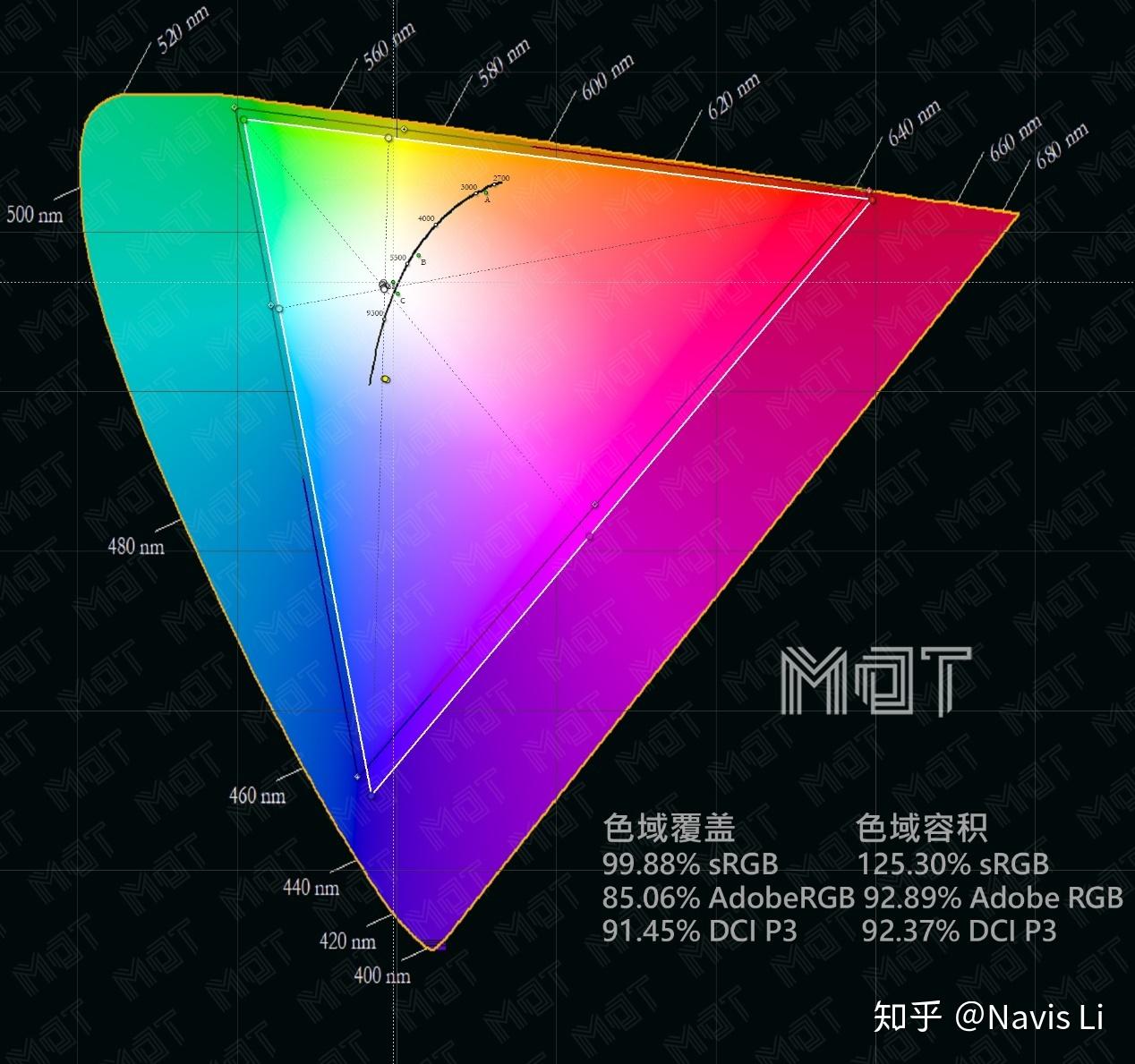 首先是色域覆盖,它代表这一块屏幕可显示多少形状,上图白色三角形为实测色域,黑色三角形为标准 sRGB 色域,两者重合度越高越好,实测 Y44w 能够覆盖: