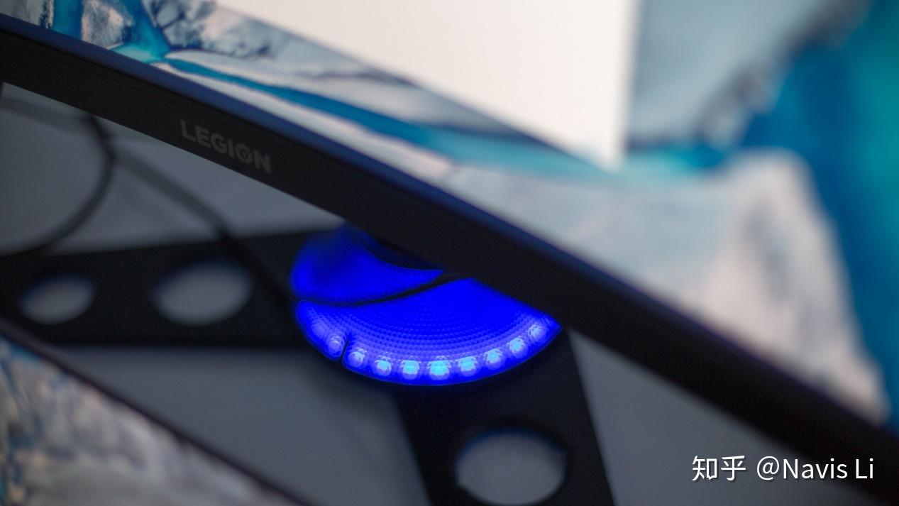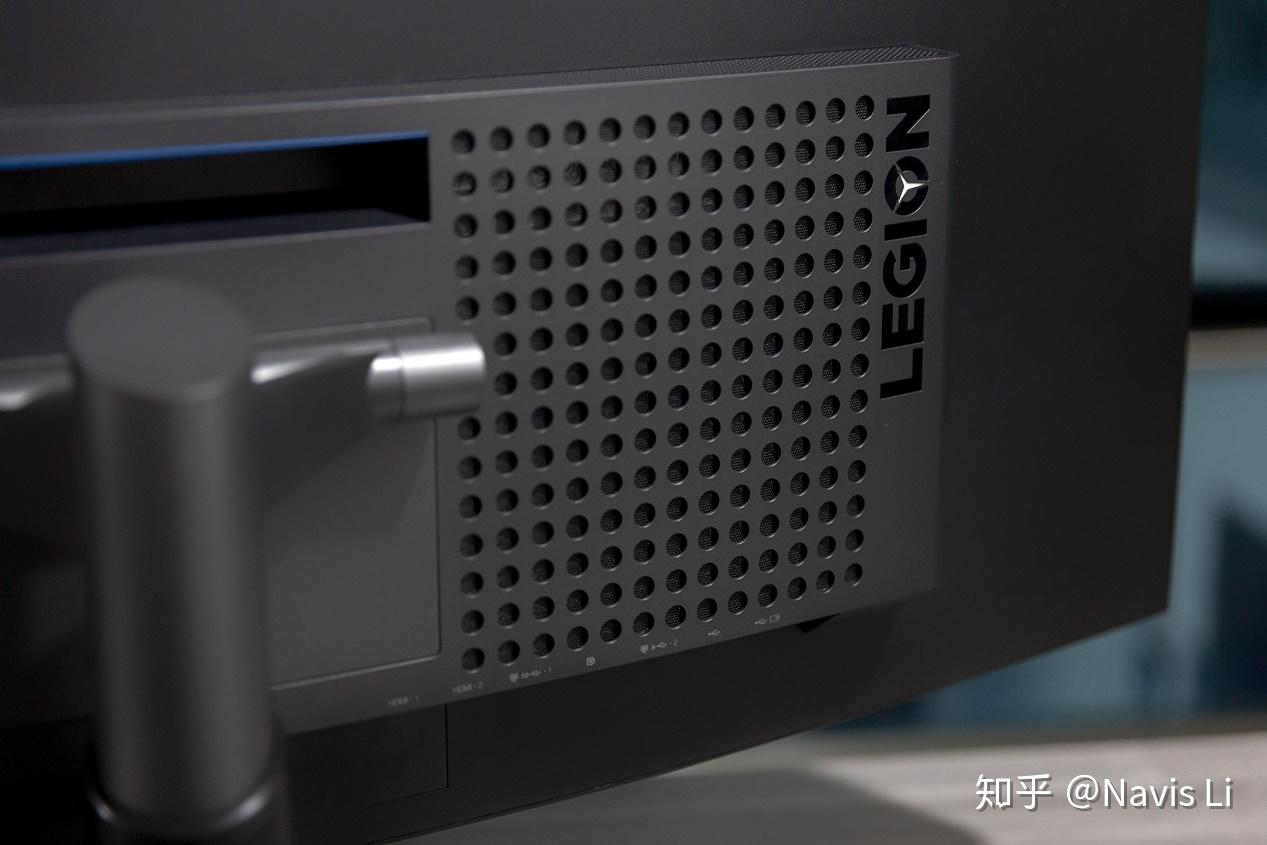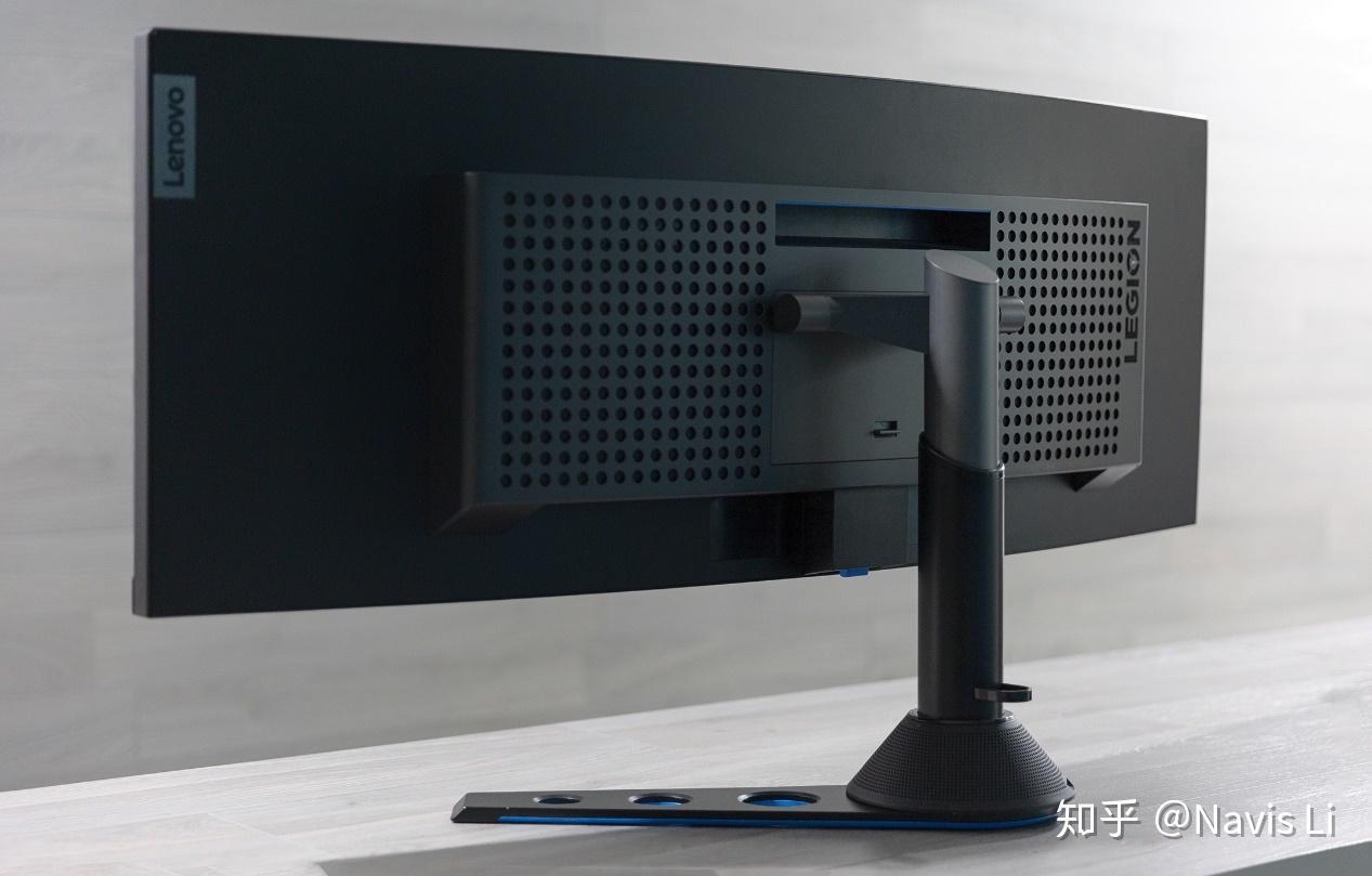 由于 43.4 英寸的巨大重量,Y44w 的反面充满了散热孔保证面板稳定,整体也走的是优雅跟简单的简约,除了两侧散热孔周围的 LEGION 标志和左上角的 Lenovo 标志之外没有其他多余元素。