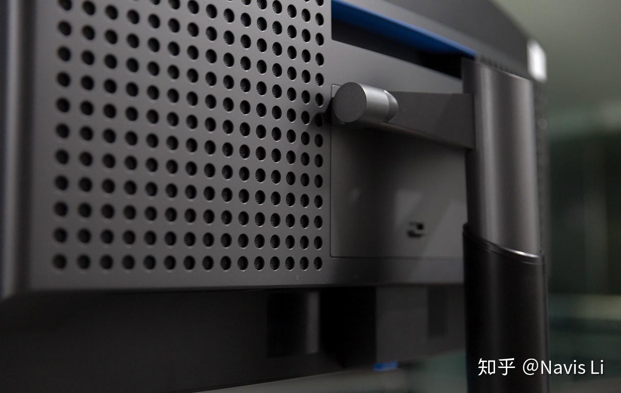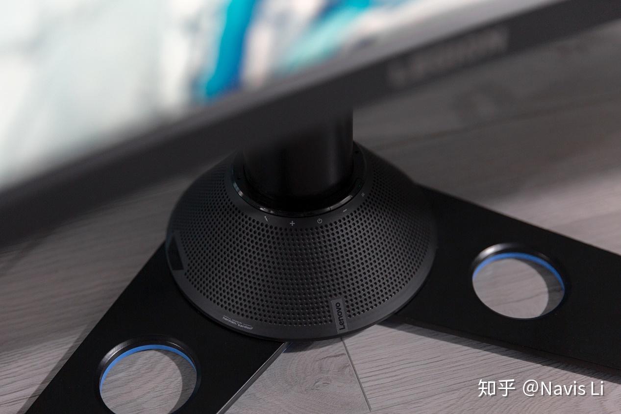 显示器支柱更下方是理线器,而底座上方的圆形是一个来自哈曼卡顿的音箱,通过 USB-C 连接到显示器本体就可以播放来自输出设备的音频。