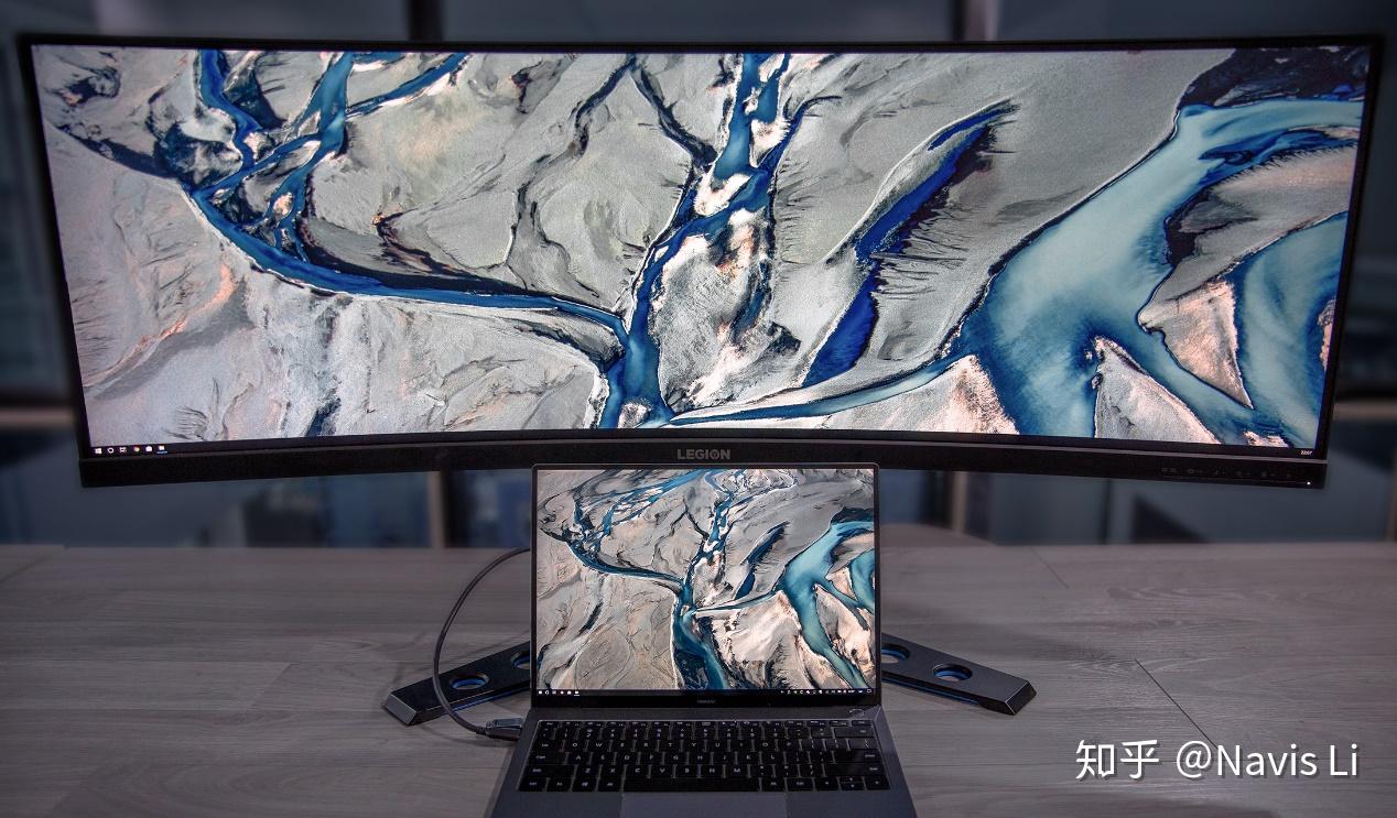 43.4 英寸对角线,1800R 的曲率的曲面屏让它更接近两个 24 英寸 16:10 显示器并排摆放给人增添的体会,但是无论双屏拼接的后盖边框有多窄,都能够减少中间的边框存在,因为 Y44w 一体的曲率跟没有中间接缝,相对于两个显示器拼接才能带给更高的沉浸感。