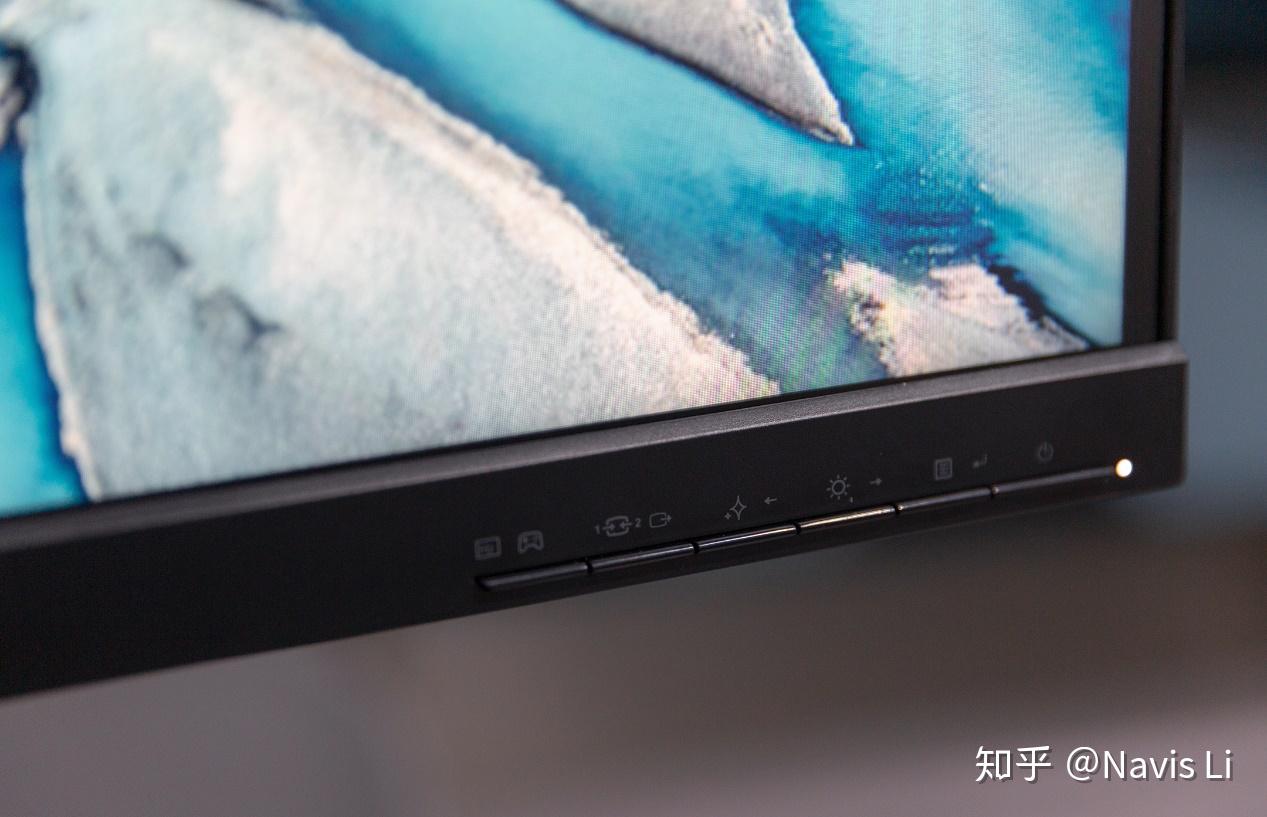 Y44w 的所有控制按钮都在机身左侧,如果之前用过 Legion 或者 ThinkVision 的显示器,那么需要就不会对它陌生,从左至右依次是:模式切换,输入源切换,显示效果切换(或左方向按钮),亮度(或右方向按钮),菜单和电源按钮。