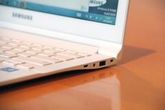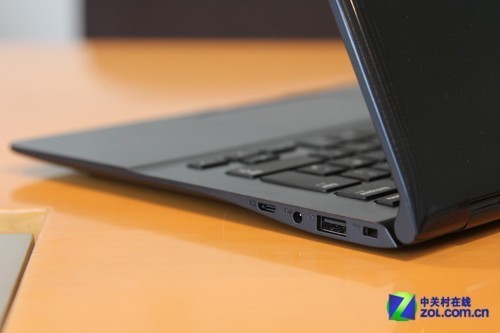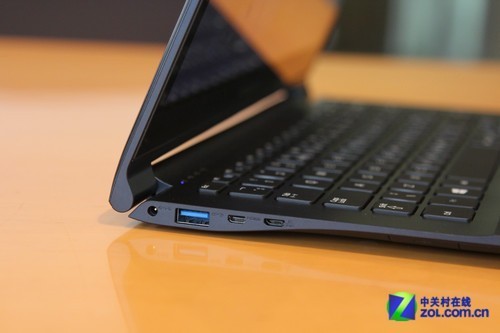 接下来一起看看三星915S3G的接口设计,很难想象在这种轻薄的纤薄上实现全长度接口,而且针对追求简洁至上的三星来说也必定不会这样做,所以在915S3G的楔形机身上大部分接口都集中在后半部分,接口排布比较紧凑。