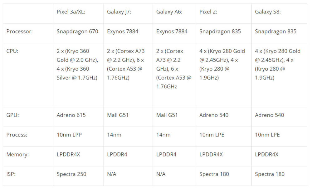我们比较了这些处理器,它们的安装价格与Pixel 3a,Pixel 3 XL相似. 比较一些与SoC性能相关的关键指标,例如CPU,GPU和RAM. 另外,我们将参考一些基准.
