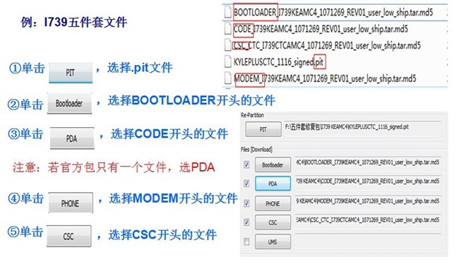 五件套有一个对应的MD5格式文件. 无需解压缩. (下图显示了三星官方的刷新工具ODIN的文件选择图)