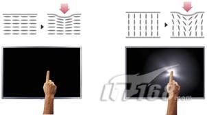 “ IPS彩色硬屏”(左)在按下后在普通的“软屏”(右)中没有水波纹现象