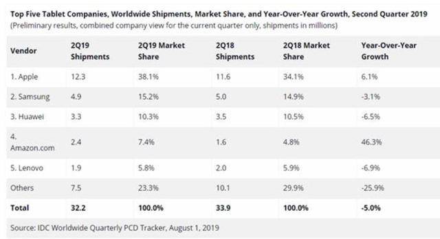 以2019年第二季度的数据为例,苹果的iPad销量为1230万台,份额为38.1%,增长了6.1%,而三星的销量为490万台,下降了同比增长3.1%,排名第二.