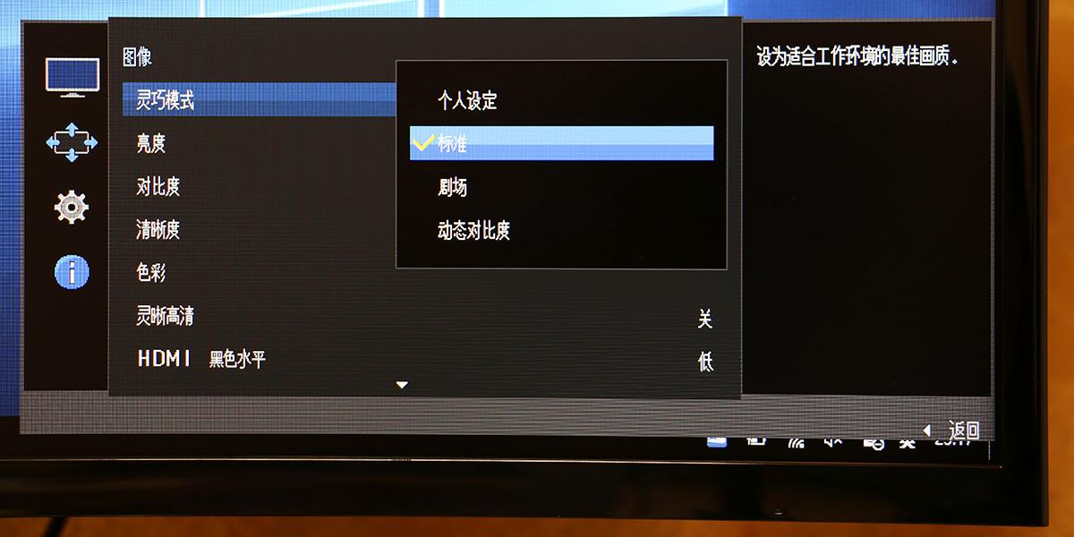 除了最基本的亮度,对比度和清晰度调整外,它还包含一个称为智能模式的东西,实际上是其他显示器上常见的场景模式. 其中,剧院模式和动态对比度模式更适合观看电影和玩游戏. 尤其是有很多黑暗场景的游戏.