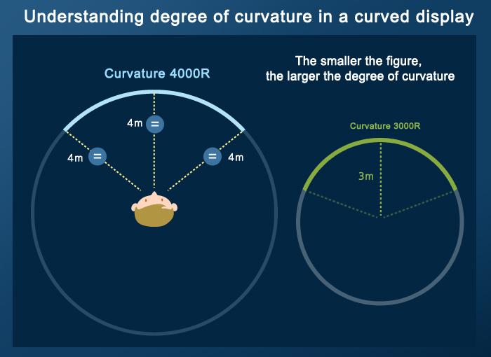 目前,市场上许多弯曲的电视和显示器的曲率均为4000R. 该曲面可以拼接成半径为4米的圆. 该曲率的最佳观看距离应约为4米. 它非常适合电视,但在显示器上使用时效果不明显. 三星1800R的曲率几乎是目前最高的曲率显示器,它将在理论上更适合紧密使用.