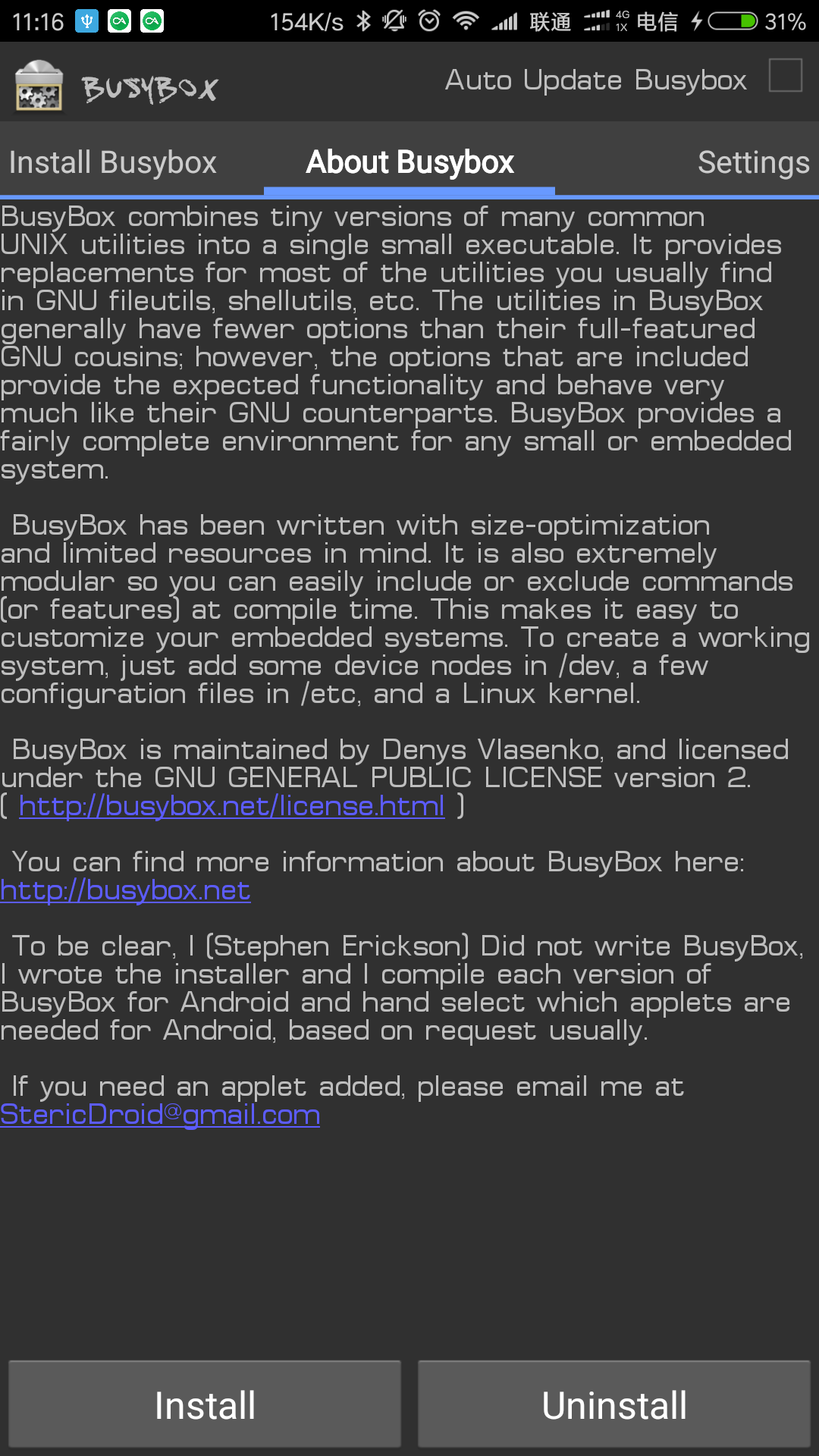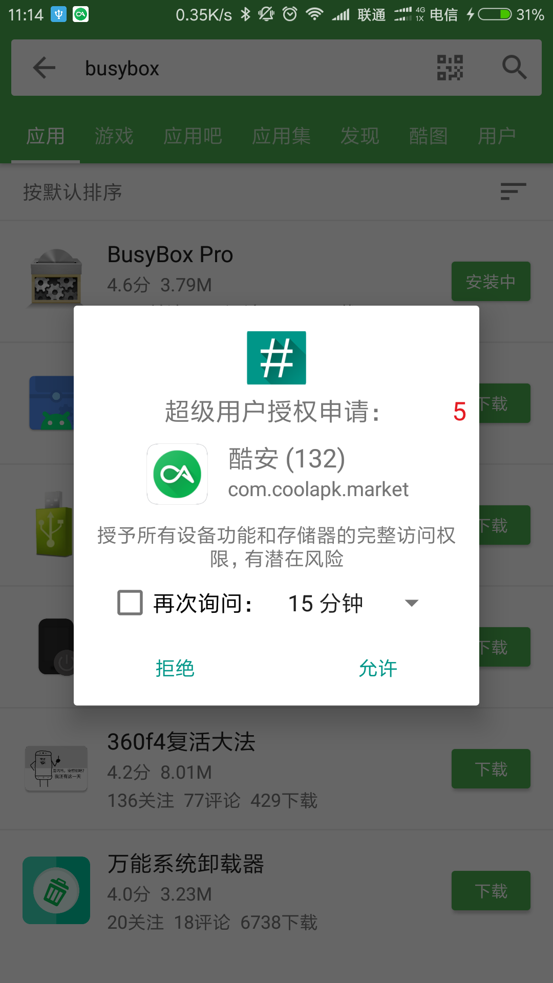 7. 下载并安装Cooan,然后在Cooan中安装BusyBox小米修改手机型号,更改型号,并对这三个应用程序进行温度控制. 当您请求root权限时,请单击“允许”,