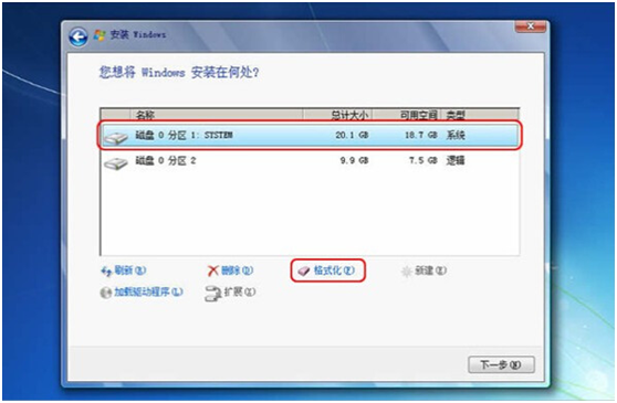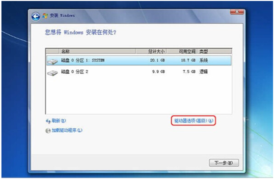 单击“自定义高级”后,下图显示了选择在Windows7中安装的硬盘分区. 在这里,您可以看到计算机的硬盘分区. 单击下图中的“驱动器选项(高级)”以在磁盘上执行更多操作,例如删除分区和格式化. 建议格式化SSD并选择SSD的驱动器号.