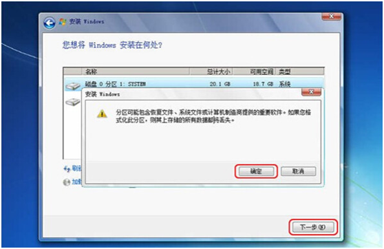 将弹出一个警告窗口. 如果格式化该分区联想固态硬盘安装,则该分区上的数据将丢失. 如果C驱动器中没有要备份的数据,请单击“确定”. 格式化完成后,单击“下一步”.