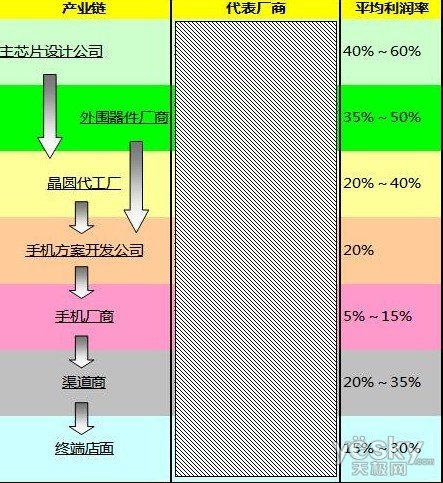 按照这个我们可以将这个产业链用简单的形式来表现出来,那就是:联发科→手机方案商(主要集中在上海)→手机集成商(深圳华强北)→手机模具商(东莞、深圳)→手机器件供应商(珠三角)→山寨手机经销商(全国各地)。