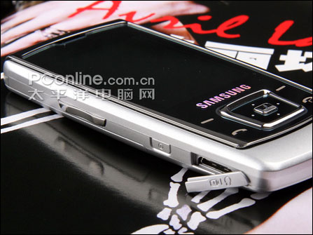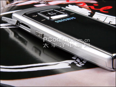 三星E840的右侧设置的是拍摄快捷键以及microSD卡的扩展接口,因为超薄机身的关系,这个拍摄键很小,手感较为一般,在待机画面下长按此键可以进入拍摄界面。即使是超薄机身,但是三星E840的microSD卡槽依旧是支持热插拔,并且在卡槽上面还搭载了防尘罩。