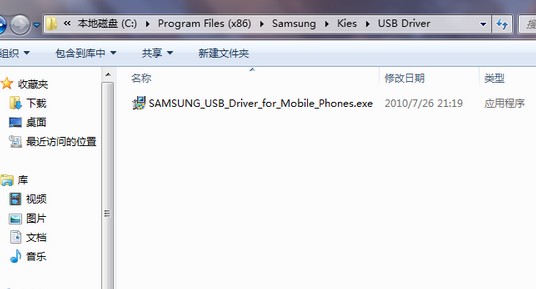 拔下数据线,到C:\Program Files (x86)\Samsung\Kies\USB Driver目录(其C:\Program Files (x86)\Samsung\Kies是kies的安装路径)找到SAMSUNG_USB_Driver_for_Mobile_Phones.exe驱动程序,重新安装驱动(不建议使用kies界面里面的“恢复驱动”)。