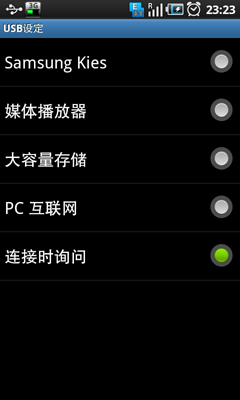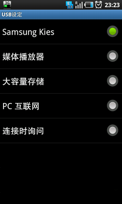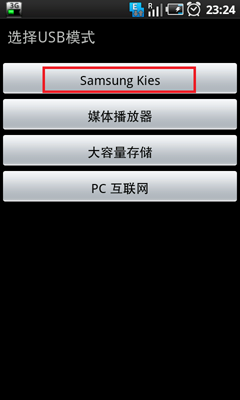 1。 如果"USB设定"中设置的“连接时询问”,我们在手机上还要手动选择一下“Samsung Kies”