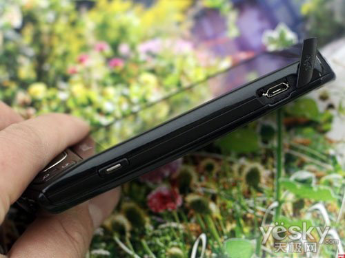 手机右侧也同样采用了简洁的设计风格,设计有一个拍照键,按键中心跟音量键一样,有银色条装饰。在右侧上部安排有一个接口,可以提供手机充电和USB数据传输两种功能。而且人性化的设计有防尘盖,可以防止灰尘进入到插孔内。