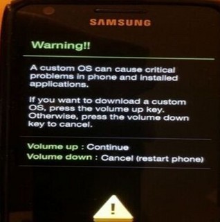 解压完成完整包后操作手机进入三星机器人挖煤的下载模式,关机后,先按着音量减小键+屏幕下方HOME键+电源键不放,等 屏幕出现开机LOGO时松开,出现警告Warning!!界面