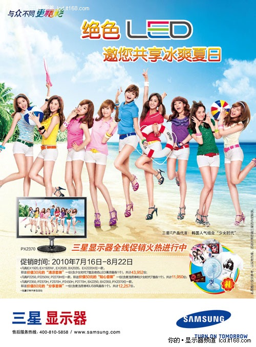 近期IT领域倍受关注的事件就是三星IT签约韩国第一人气组合——少女时代,作为三星IT全线产品的首个团体代言人,少女时代健康、阳光,可爱之中又不乏性感的形象深得人心,其韩国第一人气组合的强大团队力量与不凡的三星IT产品群非常的吻合。显示器作为三星IT产品群的重要组成部分,不但是国内显示器第一品牌,而且保持着连续十一年销量冠军的辉煌成绩。在此次的促销活动中,T恤和清凉扇都将印有少女时代形象画面,让美少女陪您一起度过炎热的夏天。