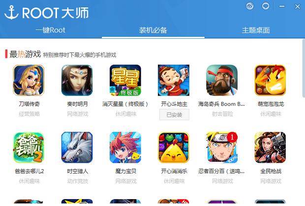 三星N7108D 解除root权限后,你可以在【装机必备】里下载游戏玩一玩,或者在【桌面主题】里下载个主题来美化手机。当然,如果你什么时候你想要重新root,还是可以重新用ROOT大师获取root权限的。如果希望手机保持一个良好的状态,可以使用安卓清理大师对三星N7108D进行手机清理和加速。