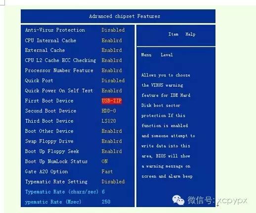 设置为USB-ZIP. 首先,设置方法是在项目上按PageUP或PageDown来切换选项. 设置完成后,按一次ESC返回BIOS主界面,