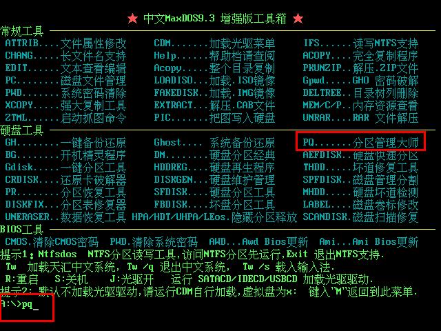 2. 然后打开“ [01]运行MaxDos9.0 Toolbox增强的C”和“ A.MAXDOS Toolbox&MAXDOS工具箱”的选项,按Enter进入增强的工具箱提示界面,我们只需要在“ A”后输入“ pq” : \>“,然后根据以上提示按Enter键;如下图所示: