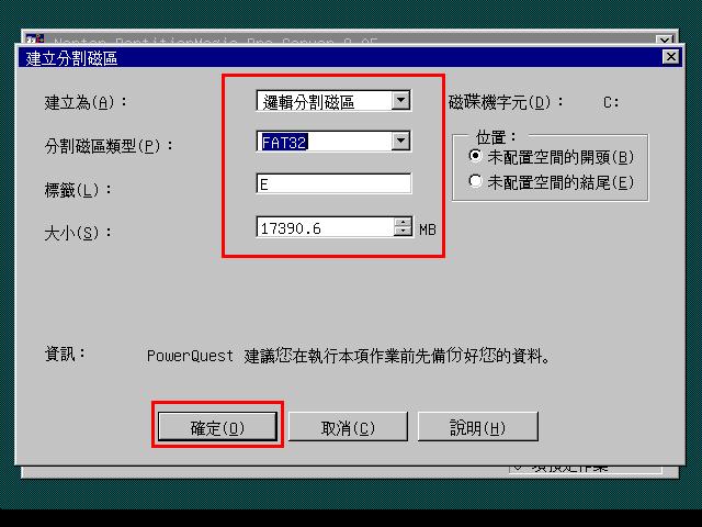 4. 然后将弹出一个用于创建分区的窗口,我们在该窗口中创建“主分区,分区类型,标签,大小”,然后单击“确定(O)”按钮;如下图所示: <
