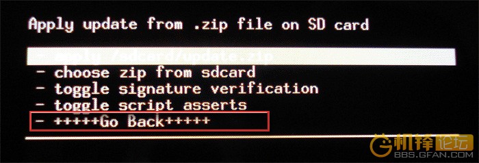 在屏幕的上半部出现下列信息。这与前面的第二个界面相同。现在要选取“Go Back”回到上一个(第一个)Recovery界面。按电源键确认。