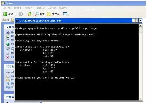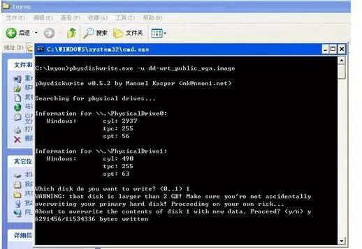程序提示“您要写入哪个磁盘?”,即要求您输入目标U盘的序列号. 注意不要选择错误的一个,否则U盘中的所有数据都会被覆盖. 输入USB闪存驱动器的序列号,然后按Enter. 屏幕提示确认是否正确以及是否实际写入. 当然,选择Y. 几秒钟后,路由器固件将写入旧计算机的USB闪存驱动器,最后提示“总共写入11534336/11534336字节”,表示写入成功.