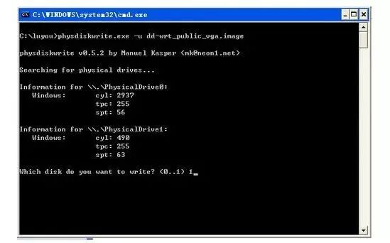 提示: “ physdiskwrite.exe -u dd-wrt_public.vga.image”命令中的“ -u”参数主要在目标硬盘或U盘大于800MB时使用. 如果旧磁盘相对较小,小于800MB,或者使用的是CF卡,则可以删除此参数.
