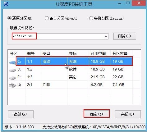 3. 等待u deep pe安装工具自动加载win7系统映像包安装文件,只需选择安装磁盘位置,然后单击“确定”按钮,如下图所示: