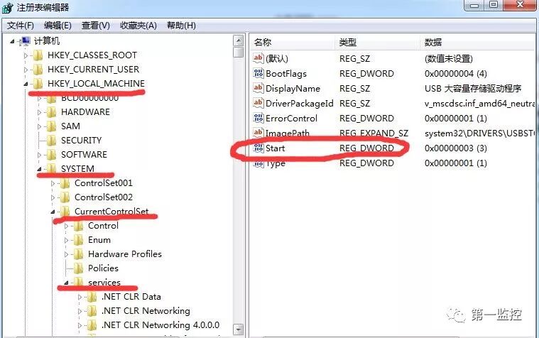 然后我们遵循以下路径: HKEY_LOCAL_MACHINE-SYSTEM-CurrentControlSet-services--USBSTOR