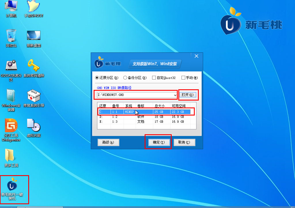 2. 进入win8pe系统后,双击运行桌面上的“老山套PE一键安装”工具. 程序运行后,将搜索USB闪存中存储的系统映像文件,并提取gho映像文件以进行显示;如果程序无法识别我们存储在USB磁盘中的系统映像文件,则可以单击右侧的“打开”按钮,然后在弹出的窗口中找到ibm笔记本重新安装系统的USB磁盘中的系统映像文件. 上窗口. 如下图所示: