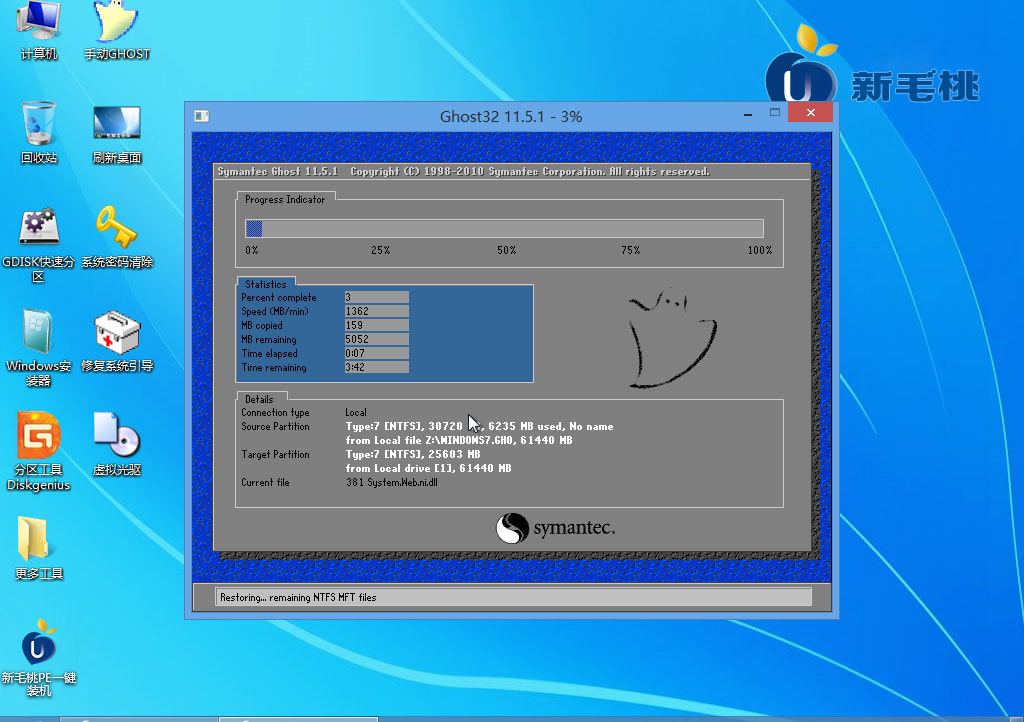 6. 接下来,您将看到重新安装系统的整个过程. 在此期间,您无需注意中间出现的任何窗口,而耐心等待所有安装步骤完成. 如下图所示: