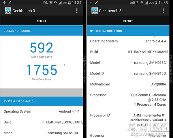高通骁龙805芯片配合3GB内存,仅这两点Note Edge就足以被称为旗舰了。Note Edge的性能表现非常突出,运行多任务机市面上流行的大型3D游戏都能保持高度流畅。下面为大家展示一下Note Edge的跑分结果,跑分成绩不能完全代表实际性能表现。